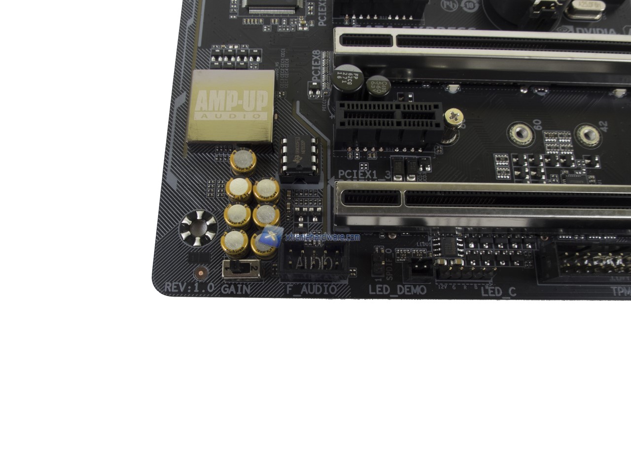 Nell’angolo sinistro della AORUS Z270-Gaming K5 è invece presente il circuito audio dedicato con chip Realtek ALC1120 corredato da supporto software Sound Blaster X-Fi MB5 e AMP-OP TI NE5532 della Texas Instruments. Non da meno anche i sette condensatori Nichicon Gold. Circuito ormai classico di molti modelli per offrire comunque un buon livello prestazionale anche nel comparto Audio dedicato.
